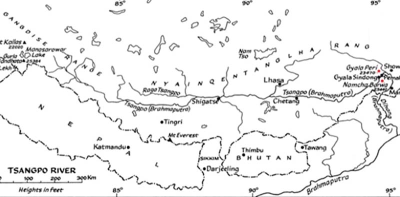 - Second group turning eastward covering the basin of the Yarlung Tsangpo river north of the Himalaya in the Tibetan plateau, then deflected south through the world’s deepest gorge and Great Bend, dominated by the mammoth Namcha Barwa (7782m) and Gyala Peri (7294m) peaks 22km apart, becoming the Brahmaputra river in India, followed by a Tibet-India crossover (for this too, ideally Chinese permission will be obtained for our India-China friendly visit).