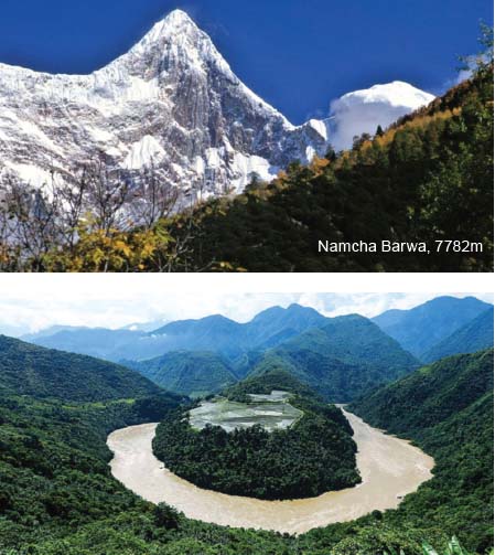 - Second group turning eastward covering the basin of the Yarlung Tsangpo river north of the Himalaya in the Tibetan plateau, then deflected south through the world’s deepest gorge and Great Bend, dominated by the mammoth Namcha Barwa (7782m) and Gyala Peri (7294m) peaks 22km apart, becoming the Brahmaputra river in India, followed by a Tibet-India crossover (for this too, ideally Chinese permission will be obtained for our India-China friendly visit).