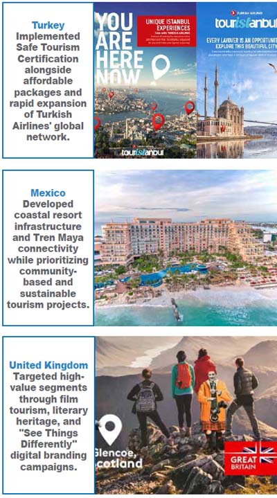 Turkey welcomed about 52 million international tourists in 2024, making it one of the fastest-recovering tourism destinations. Government incentives widely supported hotel and other service establishment investments, and aviation expansion, particularly through Turkish Airlines’ global network. Its recovery strategy relied heavily on aggressive international marketing, affordable packages, and diversified tourism products. The country focused on health safety certification, digital marketing, and product diversification to accelerate tourism recovery. The government launched the Safe Tourism Certification Programme, which established strict hygiene and service standards for hotels, restaurants, and transport providers. Major destinations such as Istanbul and Antalya introduced upgraded tourism infrastructure and modern visitor facilities. Turkey also promoted new tourism segments including wellness tourism, medical tourism, coastal areas development, cultural heritage routes, and adventure travel. Marketing campaigns targeted emerging markets and specific segments within these markets, in Europe, the Middle East, and Asia. Workforce training programmes improved hospitality standards and service quality across the tourism sector. By combining strong government leadership with proactive marketing strategies, Turkey succeeded in restoring international confidence and rapidly increasing visitor arrivals.
