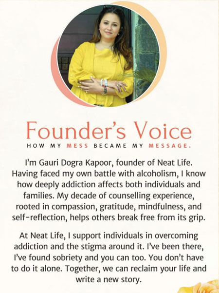 “NEAT LIFE” where I, Gauri Dogra Kapoor, offer guidance to empower individuals in recognizing and transcending addiction. I understand the havoc that substance abuse and addiction wreaks, be it on the individual or his/her loved ones. Through my journey to sobriety and subsequent counselling experience more than a decade.