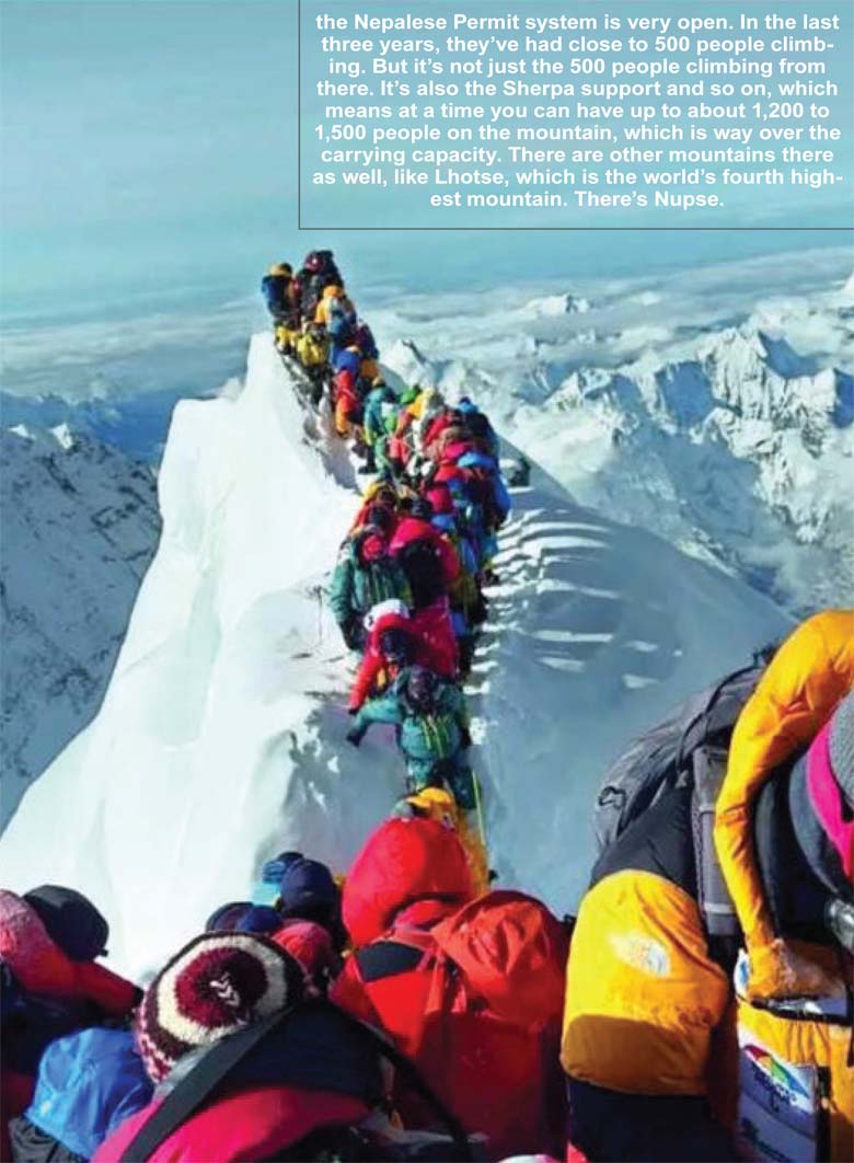 Now just to give you an example – the Nepalese Permit system is very open. In the last three years, they’ve had close to 500 people climbing. But it’s not just the 500 people climbing from there. It’s also the Sherpa support and so on, which means at a time you can have up to about 1,200 to 1,500 people on the mountain, which is way over the carrying capacity. There are other mountains there as well, like Lhotse, which is the world’s fourth highest mountain. There’s Nupse.