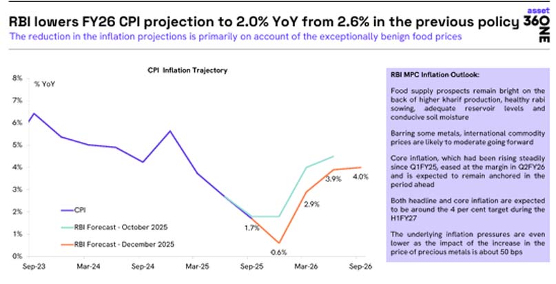 In its forward guidance, the RBI raised projections of GDP growth for FY26 to ~7.3% and lowered CPI inflation to ~2%. These revisions reflect confidence in strong real-economy momentum, benign inflation trajectory, supply-side cushioning from improved agricultural output and lower global commodity prices. However, the RBI highlighted that risks are asymmetrically tilted with food inflation remaining a structural vulnerability, oil prices and global commodity cycles remaining unpredictable, and the possibility of global monetary policy path (especially the US Fed) altering capital flows. This is why the policy stance remained Neutral, keeping future options open.
