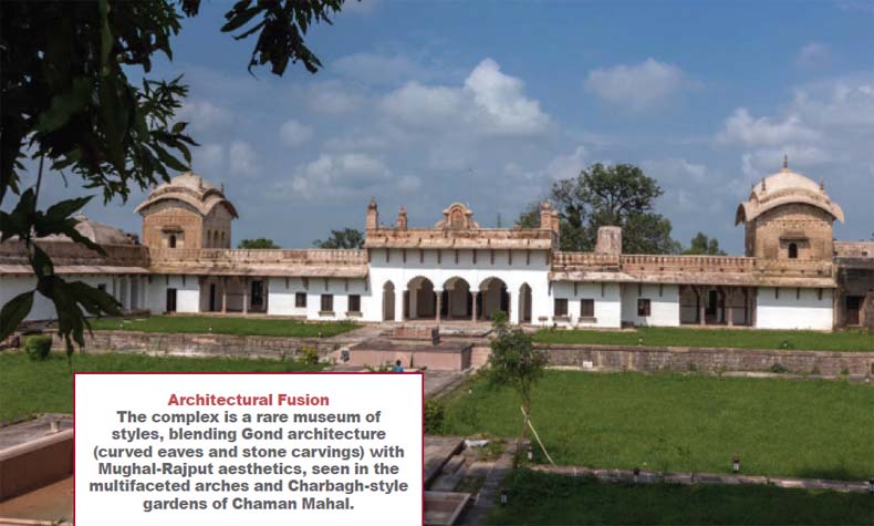 The oldest palace in the fort complex, built in the 15th-16th century. The 15th century was the period when kings and emperors began building palaces within forts for their own residences. The Gond rulers were not far behind in this achievement. The Gond Palace, built during this time, is an important example of Gond architecture. The main entrance is on the east side, in front of which is a large bastion. This three-story building is divided into two parts. The first part includes arched verandas with an open courtyard in the middle, residential rooms, and a assembly hall (Diwan-i-Aam). The second part contains pleasure pavilions, fountains, bathrooms, waterworks, a cowshed, a stable, and a rectangular garden. Arches adorned with creeper motifs, ornate pillars, and intricately carved windows are the epitome of the Gond palace’s grandeur.