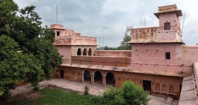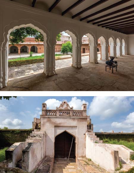 Chaman Mahal was built during this time. The Rajput-style column capitals, arches, and domes, along with the pointed Amer-style arched semi-arches on both sides, enhance the beauty of the palace. The hammam (bathhouse) in the northeast corner is in the Mughal style; the ceilings are circular, and it contains a dressing room and a main chamber accessed through a corridor, with a water tank on three sides. One tank has a copper plate at the bottom, and beneath it, on the outside, is a furnace where wood was burned to heat the water. The square rooms on the second floor of the palace have Rajput-style ceilings.