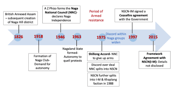 Following the Shillong Accord of November 1975, between the Government of India and the NNC, Naga groups agreed to accept supremacy of the Indian constitution, surrender arms and renounced demand for secession. Though the accord led to a temporary peace in the region, many leaders including Muivah who joined NNC in 1964, saw it as a betrayal of the cause for sovereignty leading to a split in the NNC. It resulted in the formation of NSCN(IM) in 1980 including factions of Muivah, Isak Chishi Swu and SS Khaplang. After violent internal conflicts, NSCN(IM) split into NSCN(Isak-Muivah ie IM) and NSCN- K factions. The NSCN(IM) emerged as the dominant and most potent insurgent group in Manipur and Nagaland with its armed wing and the Government of People’s Republic of Nagalim(GPRN), based at Dimapur (Camp Hebron). NSCN-K based in Myanmar.