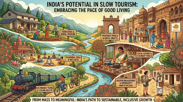 Tourism in the 21st century has largely been driven by speed, volume, and consumption. Package tours, checklist itineraries, and short stays dominate global travel patterns as well as travel habits of tourists, irrespective of the market segment they belong to. However, growing concerns about environmental degradation, cultural commercialization, tourist fatigue, and post- Covid impacts have led to the emergence of an alternative paradigm – slow tourism. This approach encourages tourists to decelerate, immerse, and engage meaningfully with destinations and the products they offer.