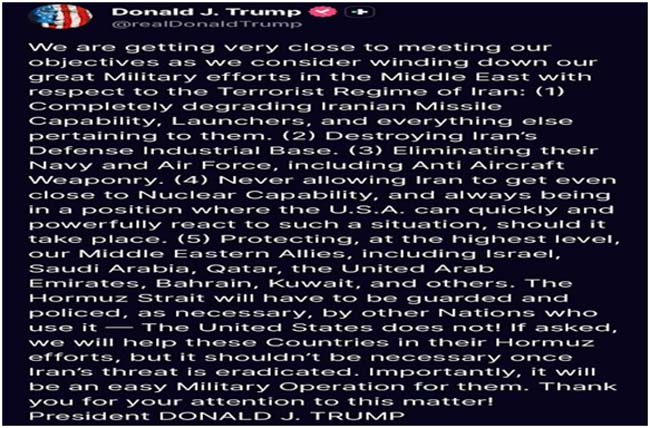 The language appears confident on the surface. Missile systems are degraded, infrastructure is hit, and naval capabilities have been reduced. It resembles a script for an honourable exit. However, the focus on allies securing the Strait of Hormuz tells a different story.